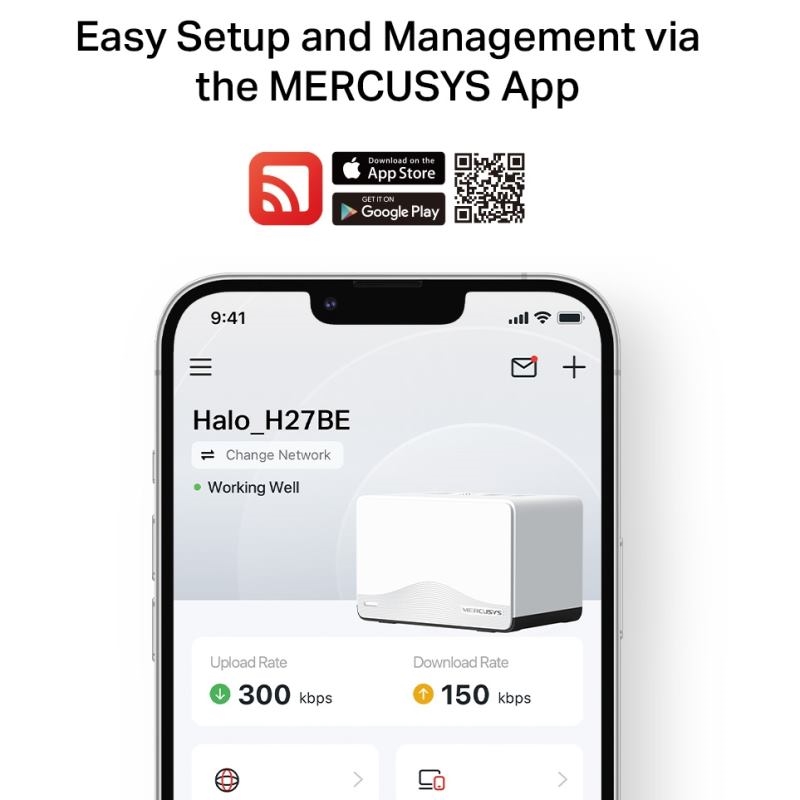 -RUs a 4K AQM pre optimálny výkon. Umožňuje pripojenie viac ako 150 zariadení súčasne, obsahuje gigabitové porty a poskytuje celoplošné pokrytie s možnosťou jednoduchého rozšírenia. Spravovateľný cez aplikáciu, spätne kompatibilný s WiFi 6/5/4 zariadeniami. (balenie obsahuje 2 jednotky H27BE)