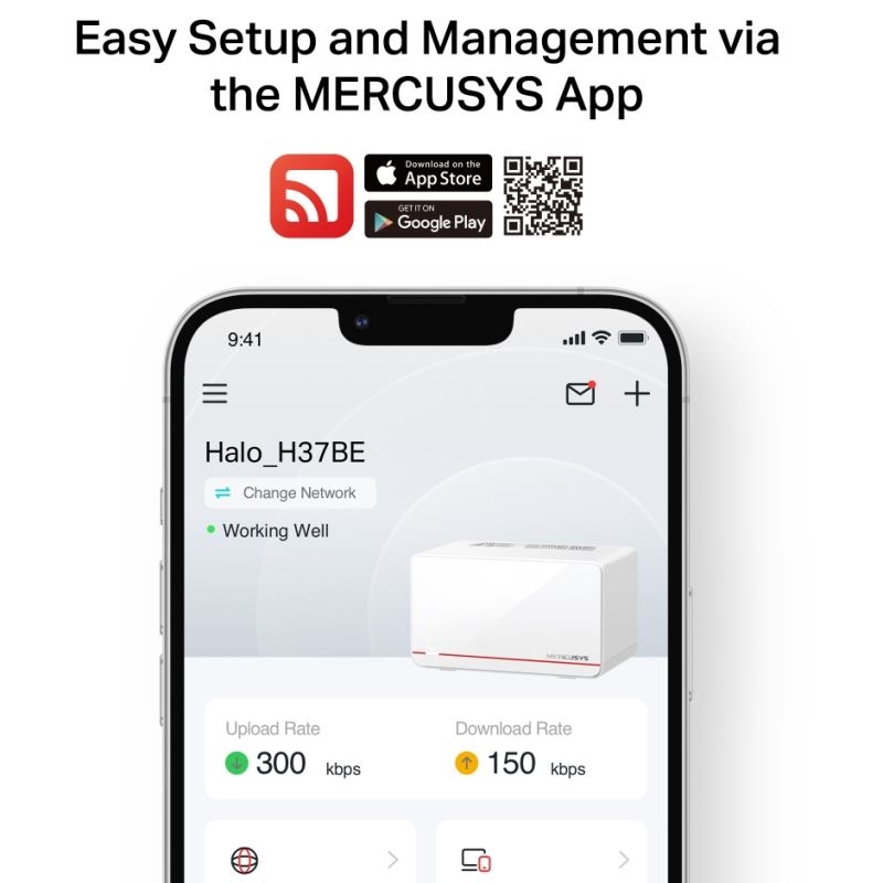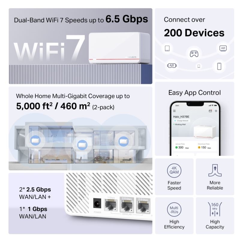 -Link Operation (MLO) na zníženie latencie, využíva 2.5G porty na maximalizáciu šírky pásma. Pokrýva plochu až 460 m2 v rámci jednotnej siete. Jednoduché nastavenie cez aplikáciu MERCUSYS a zabezpečenie WPA3 zaručuje bezpečný prístup. Obsahuje 2 jednotky, ethernetový kábel a napájacie adaptéry.