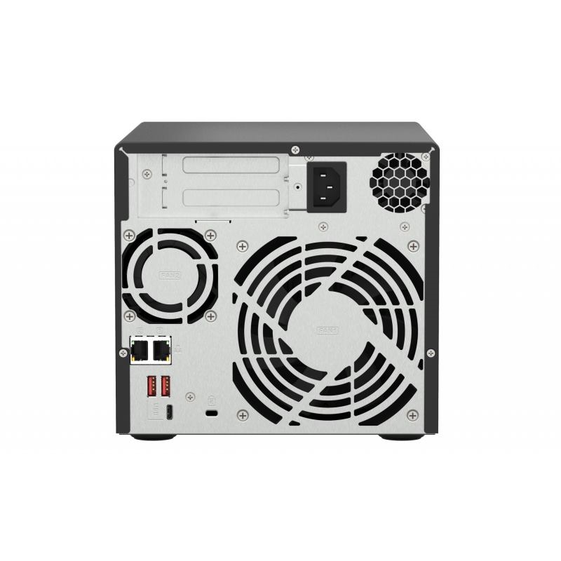 -jadrový AMD Ryzen procesor, 8GB RAM a maximálnu kapacitu 80TB. Obsahuje 10GbE port pre rýchly prenos dát a PCIe slot pre ďalšie rozšírenie. Switch QSW