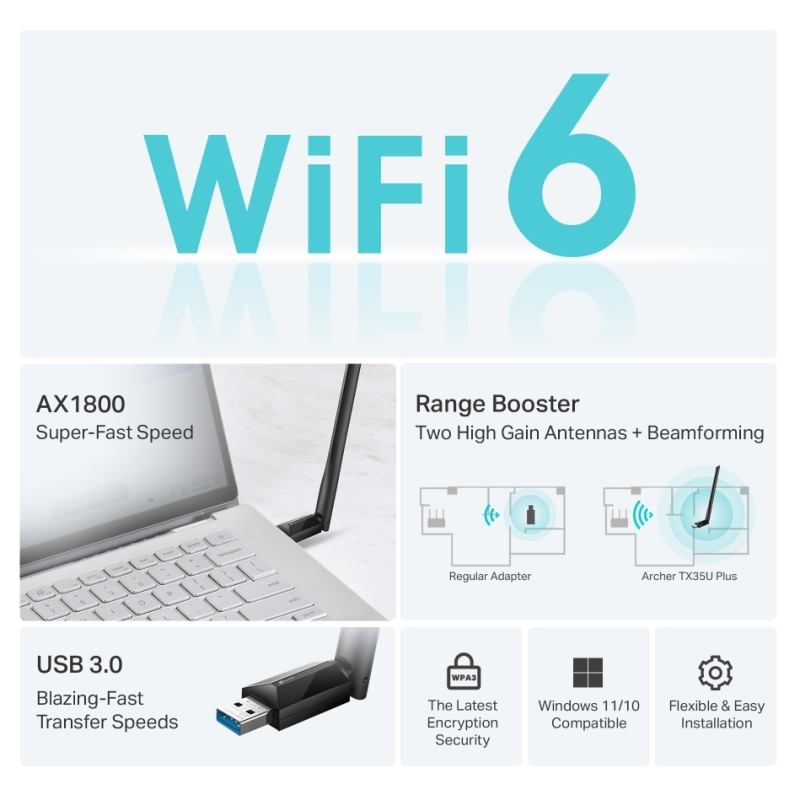Archer TX35U Plus je AX1800 WiFi 6 USB adaptér pre PC s rýchlosťou až 1800 Mbps (1201 Mbps v 5 GHz + 574 Mbps v 2.4 GHz). Má duálne antény s vysokým ziskom a Beamforming. OFDMA a MU