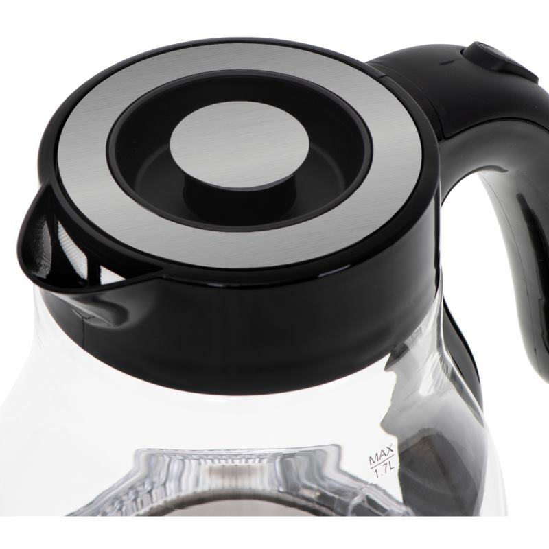 -7 osôb vďaka výkonu 2200W. Vybavená čírym ukazovateľom hladiny vody a po uvarení sa automaticky vypne. Zámok vám tiež zabráni zapnúť prázdnu kanvicu, čím šetrí energiu a zaistí vašu bezpečnosť. Sedimentový filter na druhej strane zabezpečí vhodnú kvalitu vody. Pre pohodlie je vybavená otočnou základňou, plochým dnom, nerezovým ohrievačom a lampou informujúcou o vriacej vode. Sklenená a elegantná, umožňuje naraz uvariť 1,7 l vody.