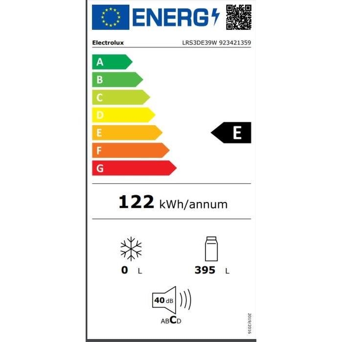 Jednodverová chladnička Electrolux LRS3DE39W v bielej farbe s celkovou kapacitou 395 litrov. Maximálna hlučnosť dosahuje 40 dB. Disponuje technológiou DynamicAir, automatickým odmrazovaním, elektronickým ovládaním, LED osvetlením a funkciou Action Cool. Chladnička ponúka 5 políc a 1 zásuvku na ovocie a zeleninu.