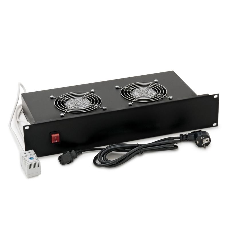 19" Horizontálna ventilačná jednotka, 2 ventilátory, hrúbka 2U, 230V / 30W, termostat. Príslušenstvo skrutka M6x16 4x, plastová podložka 6,2 4x, plávajúce matice M6 4x.