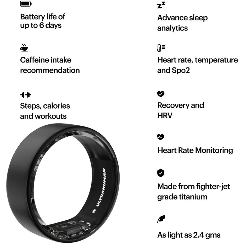 Smart prsteň, Bluetooth 5.0, krokomer, senzor srdcového tepu, okysličenie krvi, spálené kalórie, spánok, teplota, stres, výdrž až 6 dní, vodotesnosť do 100 m, kompatibilná s Android/iOS. Ultrahuman Ring AIR vám poskytne ucelený a detailný prehľad o vašich aktivitách a zdraví. Je vyrobený z leteckého titánu, má výdrž až 6 dní, hypoalergénne zloženie, kompaktnú veľkosť a elegantný dizajn. Súčasťou balenia je bezdrôtová nabíjačka a kábel USB